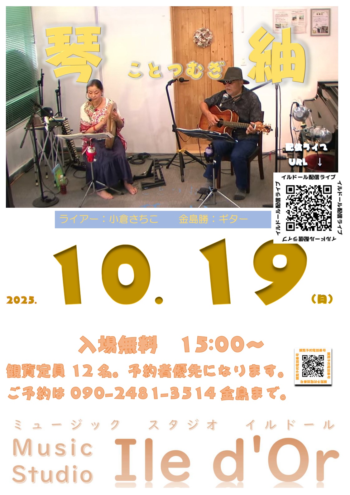 次回の配信ライブは 「琴紬+よっち」 2025年10月19日(日)15時からを予定してます。 配信ライブURL… https://www.youtube.com/@iledor6209/streams 観覧無料ですのでスタジオにお気軽にお越しください。 生ライブがご覧になれます。(10名程度) 場所 スタジオイルドール (←クリック)
