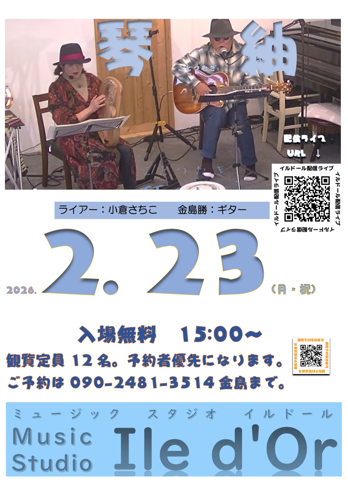 次回の配信ライブは 「琴紬」 2026年2月23日(日)15時からを予定してます。 配信ライブURL… https://www.youtube.com/@iledor6209/streams 観覧無料ですのでスタジオにお気軽にお越しください。 生ライブがご覧になれます。(10名程度) 場所 スタジオイルドール (←クリック)